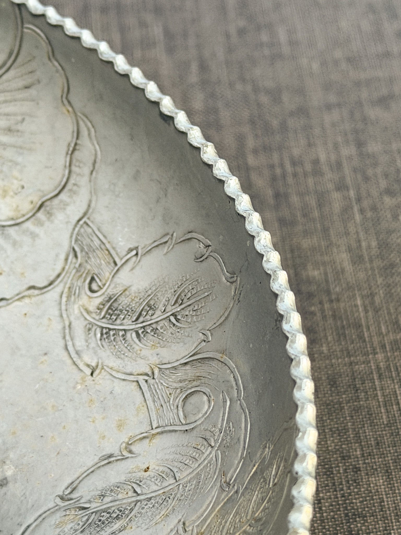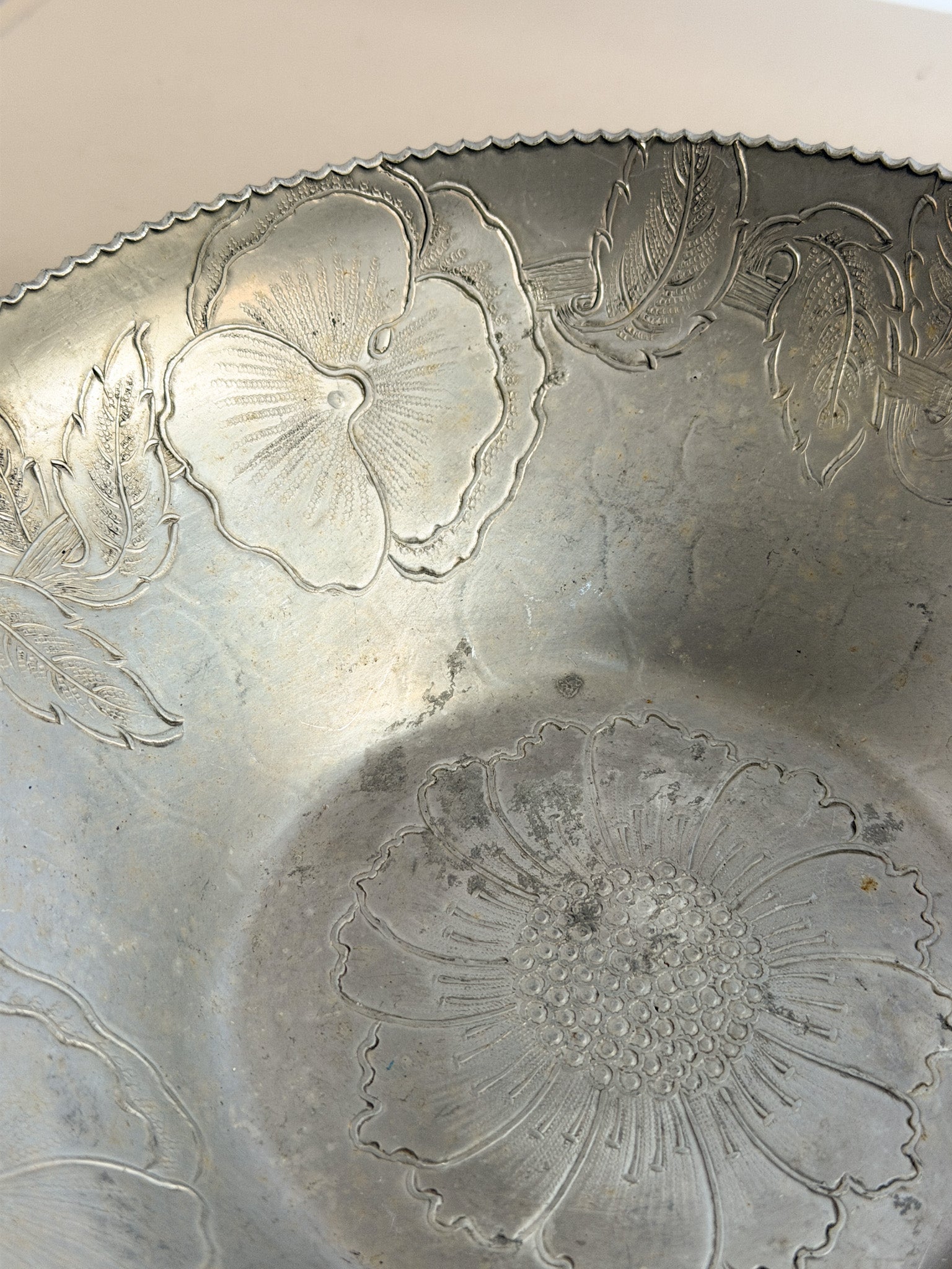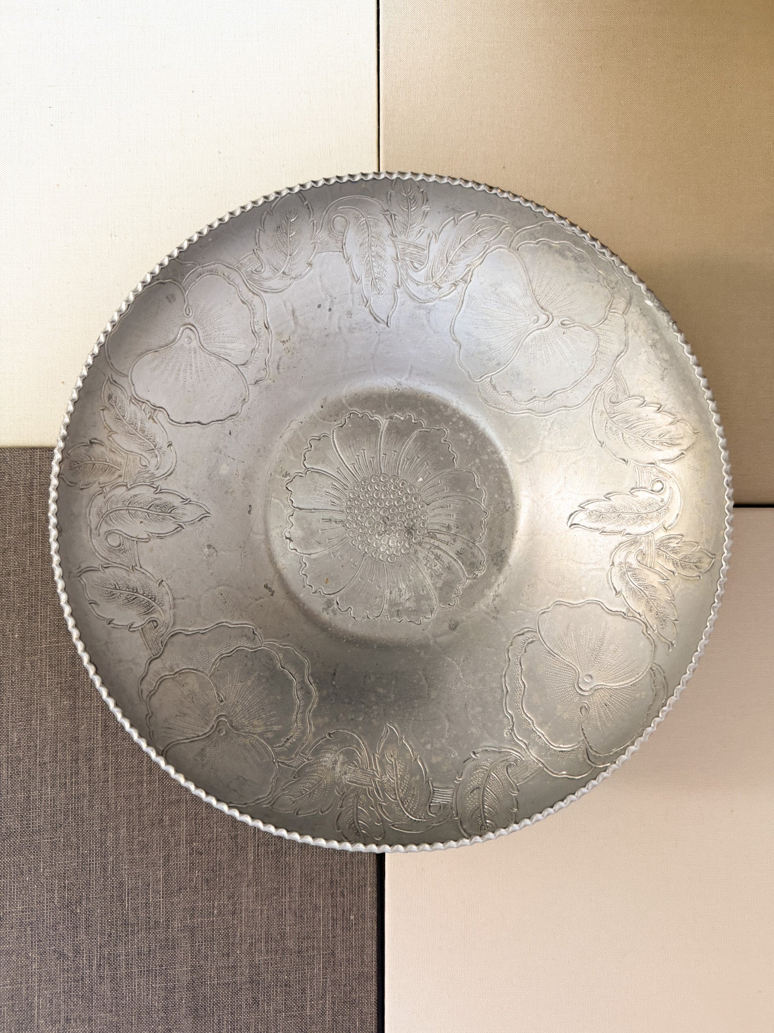 A beautifully hand-wrought aluminum bowl with floral detailing. Its lightweight design and artisanal craftsmanship make it a timeless decorative accent.