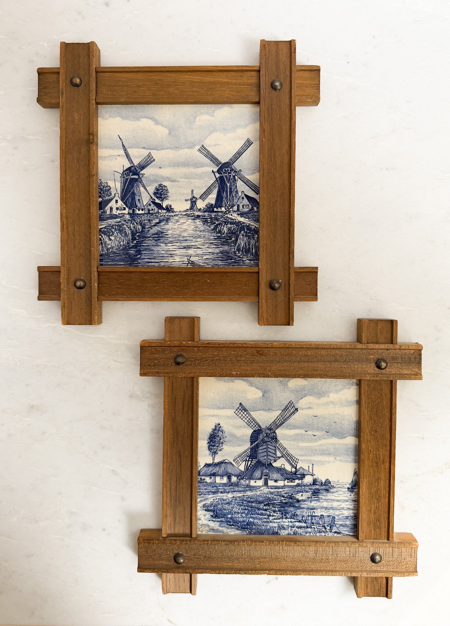 Vintage Delft Tile in Wooden Frame – Dutch Windmill
